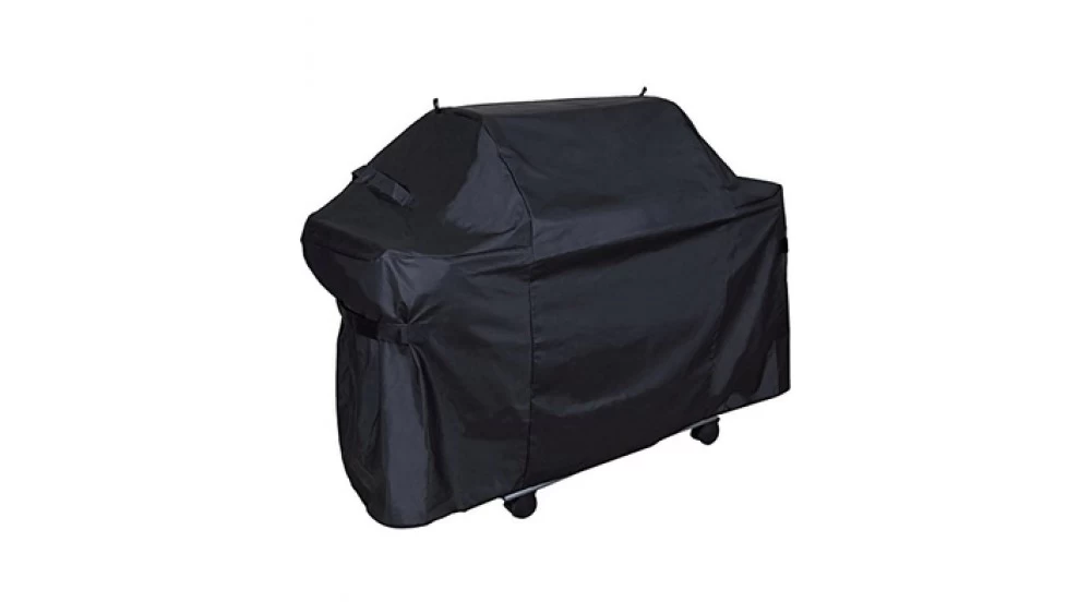 Grill cover with side handles, hanging loop and hook and loop closures.