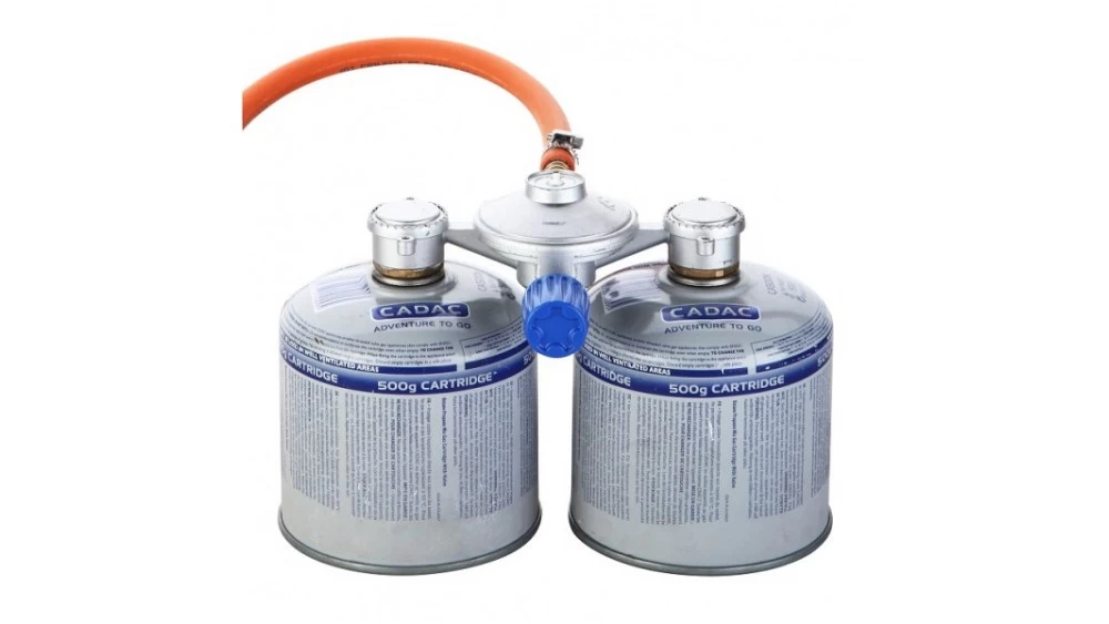 The Cadac Power Pak – This will allow for two disposable gas cartridges to be attached – the power pak includes regulator and hose to suit disposable cartridges. It does not include the cartridges themselves.